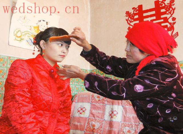 女儿完婚,俗称“未适闺女”。新娘在出嫁前,要由家中长辈为其“上头”和“开脸”。上头就是改变发型,将头发盘成发髻。开脸就是以细线为剪刀绞去脸上的汗毛并修剪眉毛。“上头”和“开脸”都寓意“黄毛丫头将变为人妇”。女方宴请款待男方迎亲者之时,也是新娘化妆穿戴之时。古时乡民没有口红,以红纸涂抹嘴唇。新娘穿戴时,要穿红肚兜,内揣黄历铜镜,意寓“心中有数,眼明如镜”;内装少许棉花,意寓“生活越过越厚实”。同时,女方要根据男方娶亲人数,派相等的人数送亲。本地迎送讲究“姑不娶,姨不送”,讲究迎送者属相不能和新娘相冲相克。新娘临出门,先回头刀切喜糕(男方迎娶时带来的那块喜糕),俗称“离娘糕”,然后口含红枣不再言语,最后由母亲或女性长辈盖上红盖头。民间认为“土能生万物,地能出黄金”。新娘出嫁时脚不能沾地,要由男方一迎亲者或新娘的哥哥背新娘上轿上车。娘家还要有若干亲友做送客,俗称“送饭的”。随赴的还有抬食牢的、抬嫁妆的、提包袱的。食牢内要装各式各样,精工巧制的和气卷。和气卷,寄寓家人对新人祝福,祝福新人和和气气,幸福美满。路上,如果遇到寺庙、井台、石碾、石狮等均需用红纸遮掩,意在防止白虎相扰,如果遇到其他嫁娶队伍,双方要互换“针线”,意为新娘的女红消灾。